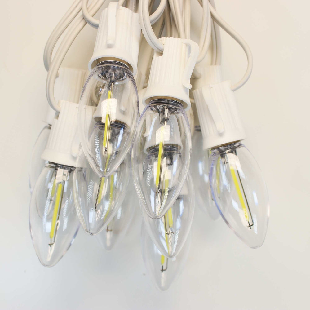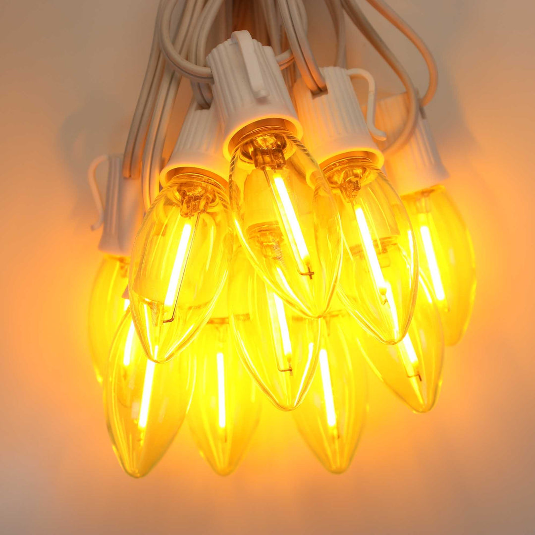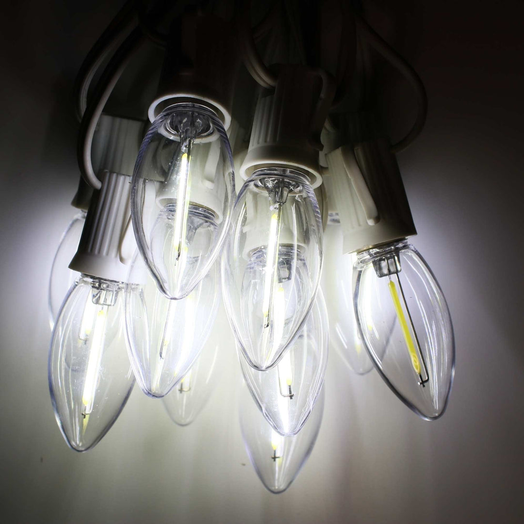 C9 Plug and Play Light Strings. Wired like traditional Christmas tree mini lights using 20 AWG wire, their single-body engineering makes them ultra-low current allowing them to be run 100's of feet in series. Rectifiers at the beginning and middle of each set significantly reduce flicker. Non-removable bulbs resist moisture and create a seal against the elements.