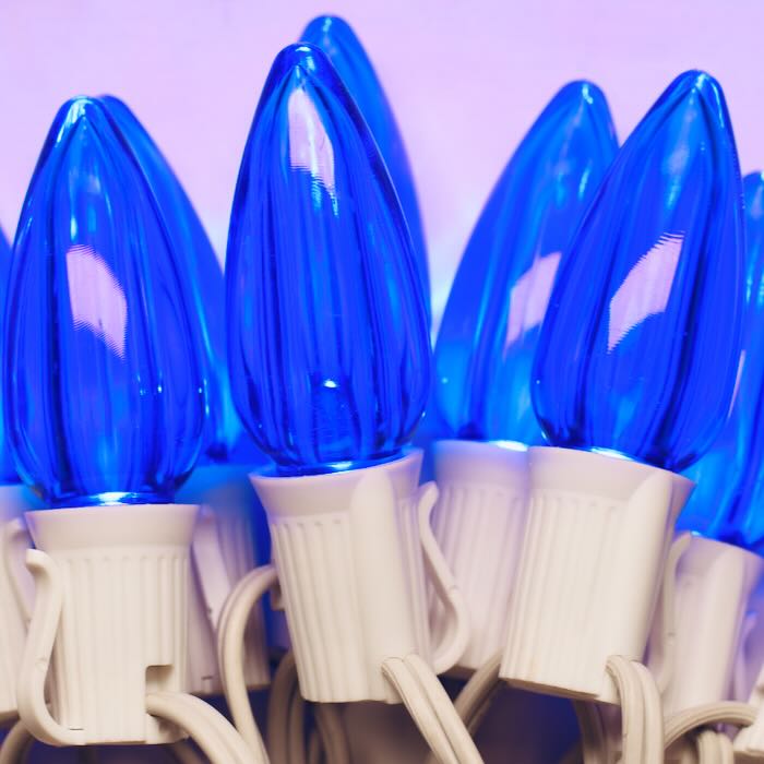 A beautiful, deep blue with a "glass-like" clarity. Our Illuminance™ Smooth C9 LED Blue bulbs create a stunning, frosty look in a bold C9 size. The clear shell allows for a rich, true-blue glow, perfect for a winter wonderland.