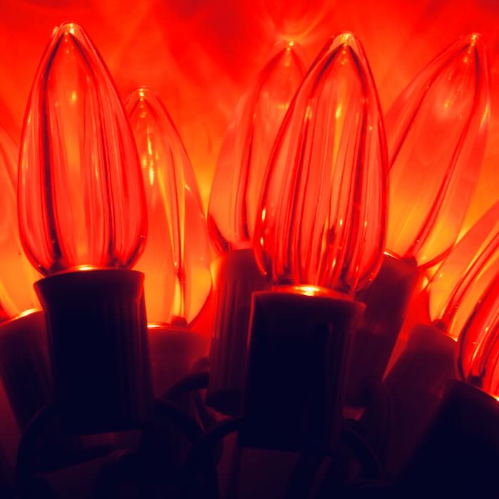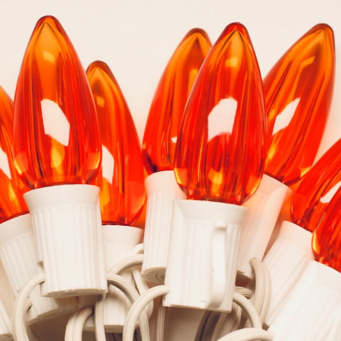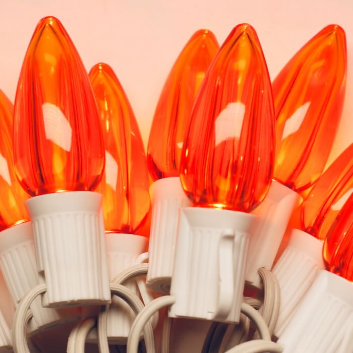 A bright, clear orange with a "glass-like" finish. Our Illuminance™ Smooth C9 LED Orange bulbs provide a vibrant, spooky glow in a bold C9 size. The transparent shell makes the color pop, perfect for an eye-catching Halloween display.